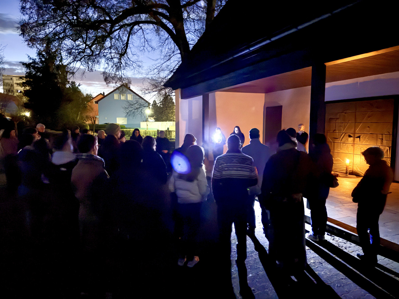 Es war noch dunkel, als sich die Teilnehmerinnen und Teilnehmer der Osternacht an der Friedhofshalle trafen. In der Stille der Nacht stand dort die Osterkerze mit einer kleinen Flamme und erleuchtete einen Korb mit Steinen, von denen sich jede und jeder einen nahm. Gemeinsam machte sich die Gemeinde anschließend auf den Weg zur Kirche. Der Zug wurde von der Osterkerze angeführt und endete im dunklen Kirchenraum. Dort wurde das Thema der Osternacht deutlich: „Einen Stein ins Rollen bringen“.