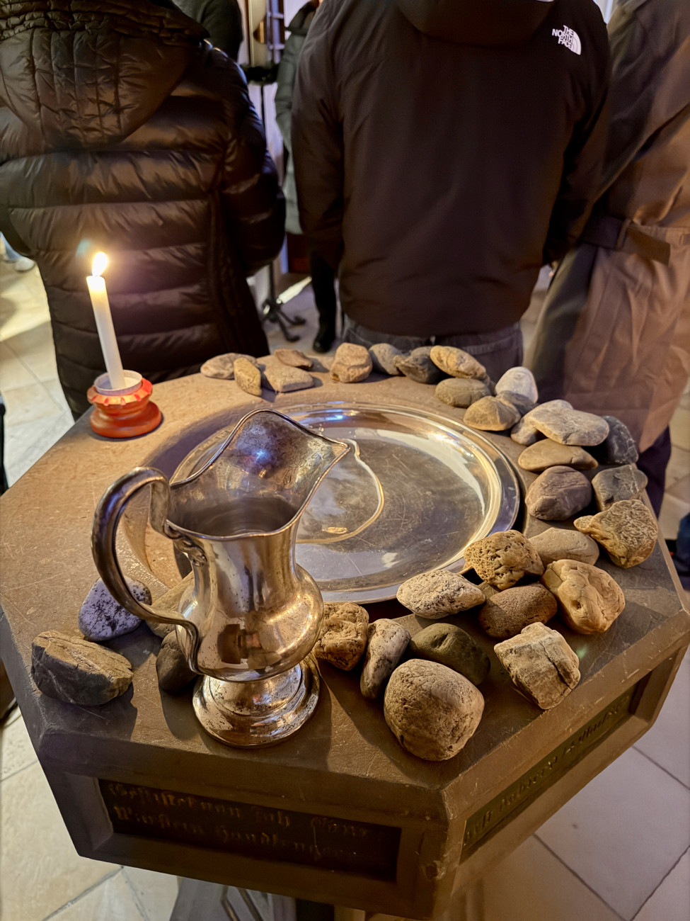 Alle waren eingeladen, zum Taufstein zu kommen – mit ihrem Stein für das, was belastet, und mit einer Kerze als Zeichen des Lichts, das Gott in jeden von uns durch Jesus Christus gelegt hat. Am Taufstein konnten die Steine abgelegt und ein Kreuzzeichen empfangen werden – als spürbare Erinnerung: Gott kennt uns und sagt Ja zu uns. Bei der Tauferinnerung sprach Barbara Weider jedem persönlich dieses Zeichen zu und machte so die Zusage Gottes erfahrbar.