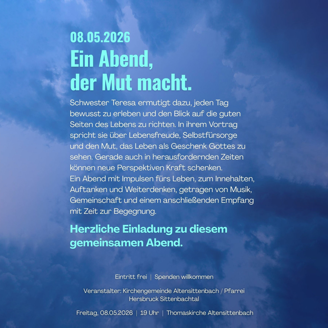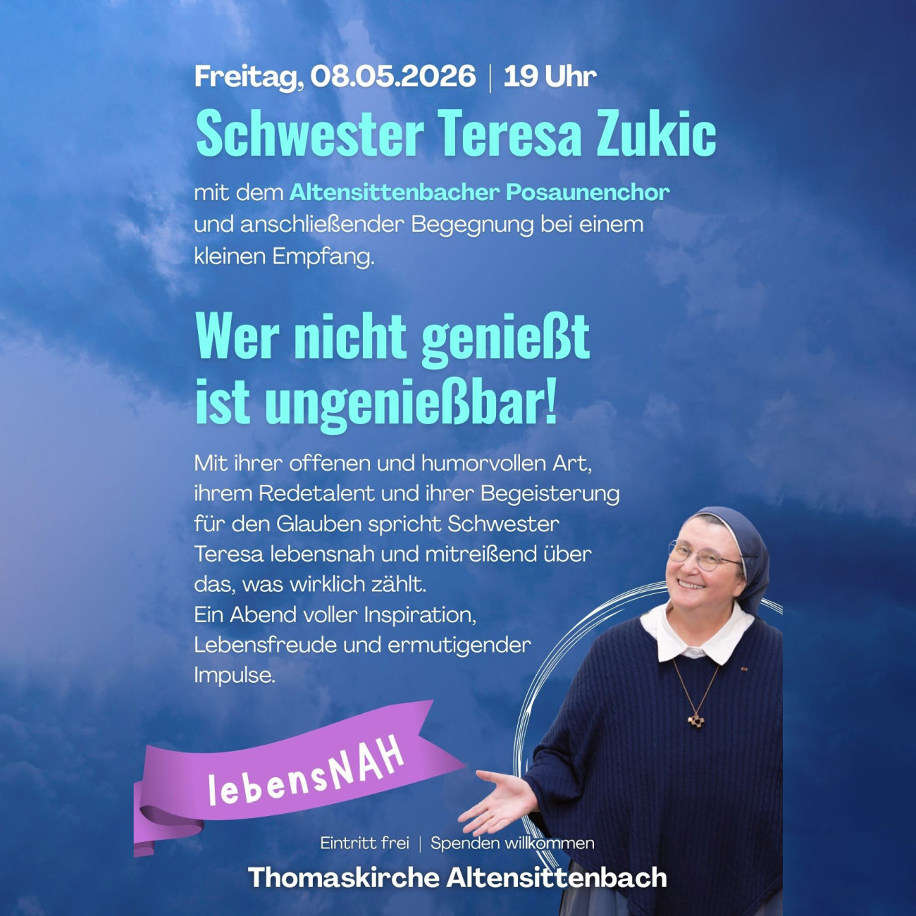 Schwester Teresa ermutigt dazu, jeden Tag bewusst zu erleben und den Blick auf die guten Seiten des Lebens zu richten. In ihrem Vortrag spricht sie über Lebensfreude, Selbstfürsorge und den Mut, das Leben als Geschenk Gottes zu sehen. Gerade auch in herausfordernden Zeiten können neue Perspektiven Kraft schenken. Ein Abend mit Impulsen fürs Leben, zum Innehalten, Auftanken und Weiterdenken, getragen von Musik, Gemeinschaft und einem anschließenden Empfang mit Zeit zur Begegnung.